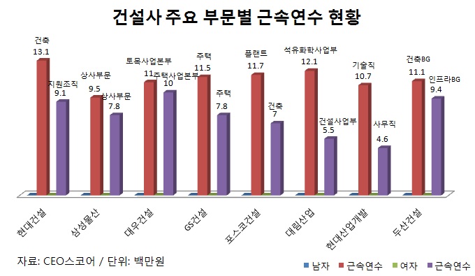 남성들의 근속년수가 8년 6개월로 10개 건설사 평균에는 미치지 못한 반면, 여성 직원들은 6.9년으로 평균보다 1년 이상 길었던 점이 다소 영향을 끼친 것으로 보인다.