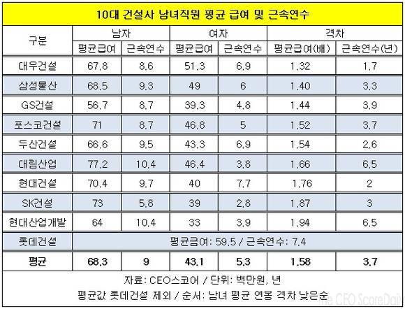 대림산업은 남성 직원 평균 연봉이 여성 직원의 1.66배였고, 현대건설은 1.76배, SK건설은 1.87배, 현대산업개발은 1.94배였다. 이들 건설사는 남녀 직원 간의 근속연수 차이가 연봉 격차를 벌리는 데 일조한 것으로 나타났다.