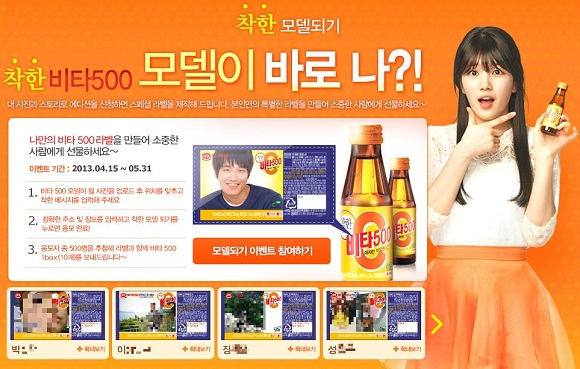 '착한 모델되기' 이벤트에 참여는 비타500 브랜드 페이지에 접속해 비타500 모델이 될 사진을 올리고 착한 메시지를 입력하면 된다.