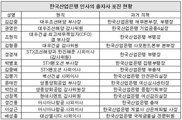 금호산업도 올 3월 김왕경 전 이사가 사외이사로 왔다. 휴대폰 등에 사용되는 박막액정표시장치 핵심부품을 생산하는 태산엘시디에도 배성흥 전 국제금융실 전문위원이 사외이사로 있다. 과거에도 산업은행 출신 인사들이 출자회사로 재취업하는 관행이 논란이 된 바 있다.