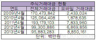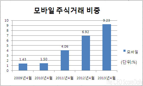20일 재벌 및 CEO, 기업 경영평가 사이트인 CEO스코어(대표 박주근)에 따르면 모바일 기기를 통한 주식거래 금액은 올 4월 8조8천501억6천100만 원으로 전체 주식거래대금 95조8천832억8천300만 원 중 9.23%를 차지했다. 이는 4년 전인 2009년 4월 모바일 거래대금이 2조4천330억2천400만 원이었던 데 비해 5조8천억 원 가량 늘어난 금액이다.