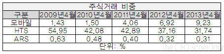 이에 따라 2009년 4월 1.43%에 불과했던 모바일 거래비중도 2011년 4.05%, 2012년 6.92%를 거쳐 올해 10% 돌파를 눈앞에 두고 있다. 이에 비해 HTS와 ARS를 통한 주식거래는 2010년 이후 줄곧 하락세를 보이고 있다. HTS 거래대금은 2009년만 해도 전체 주식거래대금의 54.95%로 과반을 차지했으나 최근 비중은 31.74%에 그쳐 4년 만에 23.21%포인트나 하락했다.