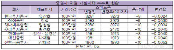 삼성증권(대표 김석)도 모바일 거래 수수료를 100만 원 당 2천982원에서 2천973원으로 0.30% 줄였다. 또 하나대투증권(대표 임창섭)의 모바일 거래대금 수수료는 지난해 3월보다 0.34% 내린 100만 원 당 2천970원, 우리투자증권(대표 황성호)은 지난해 1월 대비 0.40% 줄어든 2천470원을 기록했다. 현대증권(대표 김신.윤경은), 대신증권(대표 나재철)은 0.40% 감소했으며 신한금융투자(대표 강대석)는 0.53% 줄었다.