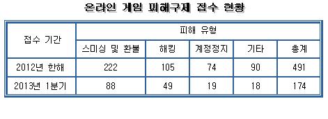 소비자문제 연구소 컨슈머리서치(대표 최현숙 www.consumerresearch.co.kr)가 소비자고발센터에 접수된 온라인게임 관련 조사 결과 2012년 한 해 동안 접수된 피해 구제 요청건은 491건이었다. 스미싱 피해가 급격이 늘어난 올 해는 1분기에 접수된 불만 건수만 174건이었다.