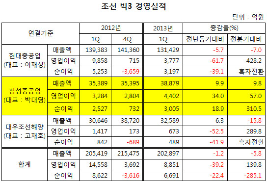 대우조선해양은 1분기 매출이 3조2천589억 원으로 전년 동기 대비 6.3% 증가했으나, 영업이익은 52.5% 급감한 673억원, 순이익은 41.9% 감소한 489억원에 그쳤다. 이 회사 역시 현대중공업과 마찬가지로 전분기 마이너스였던 순이익이 흑자로 전환했고, 영업이익도 전분기보다 큰 폭으로 증가했다.