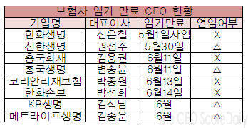 21일 보험업계에 따르면 KB생명과 신한생명, 코리안리재보험, 흥국생명, 흥국화재 등이 다음 달로 사장 임기가 끝난다.