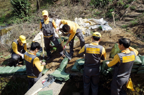 실제로 KB국민은행 임직원 50명으로 구성된 'KB 50인 봉사단'은 지난달 18일 은평구 응암동의 재해 취약지역을 찾아 축대 설치 봉사활동을 실시했다. 산사태, 급경사지 등 인명 피해가 우려되는 지역에 방지턱 및 축대 설치를 통해 재해를 사전에 예방할 수 있도록 했다.