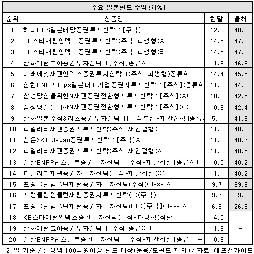 올 들어 수익률이 가장 좋은 일본펀드는 하나UBS자산운용(대표 진재욱)의 일본배당증권투자신탁1(주식형)으로 21일을 기준으로 한 올해 수익률이 48.8%에 달했다.