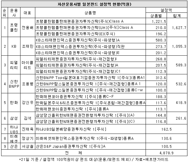 단일 펀드로는 프랭클린의 프랭클린템플턴재팬증권자투자신탁(주식) 클래스A가 1천221억 원으로 2위인 KB스타재팬인덱스증권투자신탁(주식-파생형)A를 멀리 따돌리고 압도적인 1위를 차지했다.