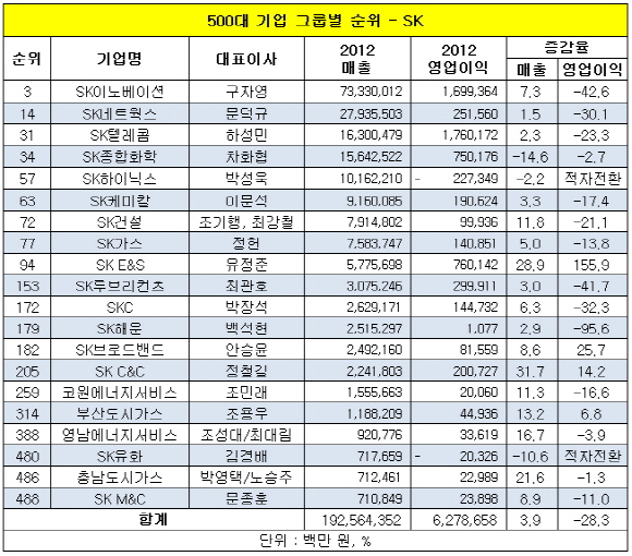 그룹 내 매출 1위인 SK이노베이션은 3조 가까운 영업이익을 기록했던 2011년에 비해 42.6% 줄어든 1조6천994억 원의 영업이익을 기록하는 데 그쳤으며 SK루브리컨츠(대표 최관호, 153위) 역시 2천999억 원으로 전년대비 41.7% 줄어들었다.