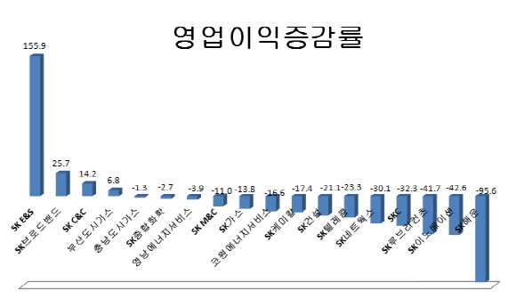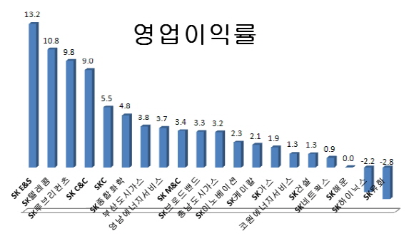 반면 SK유화와 SK하이닉스는 적자전환하면서 -2.8%, -2.2%의 영업이익률을 냈고 SK해운과 SK네트웍스도 각각 0.04%, 0.9%의 0%대 영업이익률을 기록하는 데 그쳤다.