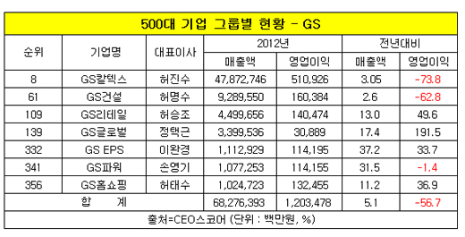 그룹 내 매출 1위인 GS 칼텍스는 2조 원에 가까운 영업이익을 기록했던 2011년에 비해 73.8% 줄어든 5천109억 원의 영업이익을 기록하는 데 그쳤으며 그룹 내 2위인 GS 건설 역시 1천603억 원으로 전년대비 62.8% 줄어들었다.