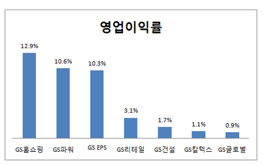 GS 홈쇼핑이 영업이익률 12.9%를 기록하며 가장 우수한 성적을 냈고 GS 파워와 GS EPS가 각각 10.6%와 10.3%의 영업이익률을 기록했다.
