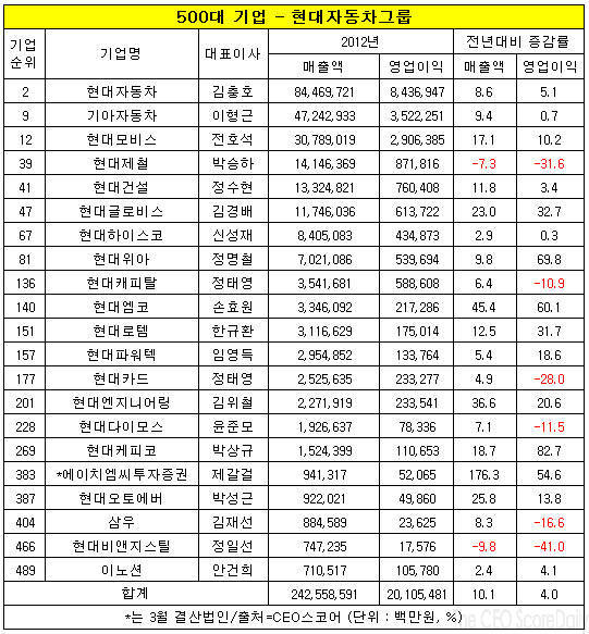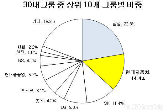 현대차 계열 21개 기업의 지난해 매출 총액은 국내 500대 기업 전체 매출의 9.7%의 비중을 차지해 삼성그룹(회장 이건희)에 이어 2위에 올랐다. 또 30대 그룹 전체 매출에서는 14.4%의 비중을 차지해 역시 삼성에 이어 두 번째로 높았다.