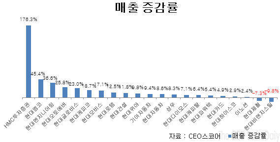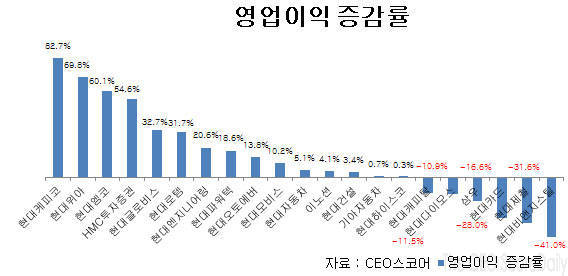 자동차 전자제어시스템 전문기업인 현대케피코는 영업이익도 82.7%나 늘어 최고의 증가율을 기록했고, 현대위아(대표 정명철)가 69.8%, 현대엠코가 60.1%로 그 뒤를 이었다. 이어 HMC투자증권(54.6%)과 현대글로비스(32.7%), 현대로템(31.7%) 등도 상위권에 이름을 올렸다.