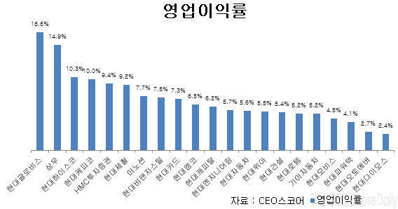 영업이익률은 현대캐피탈(대표 정태영)이 16.6%, 이노션(대표 안건희)가 14.9%로 각각 1, 2위를 차지했다. 이어 현대엔지니어링이 10.3%, 현대자동차 10.0%, 현대모비스가 9.4%로 그 뒤를 이었다.