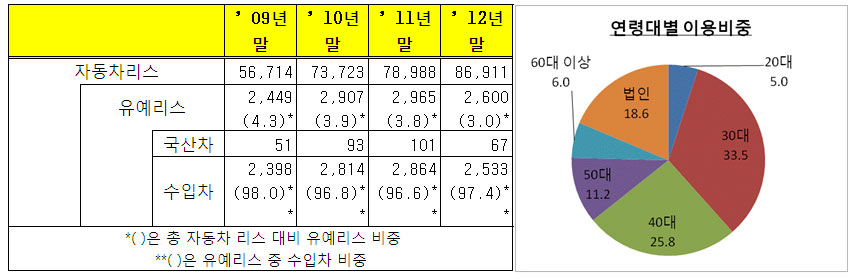 유예리스의 경우 현재 15개 여신전문금융회사가 취급 중이며 2012년말 기준 취급잔액이 2천600억원으로 전체 자동차 리스 잔액(8조7천억원)의 3.0%를 차지하고 있다. 총 유예리스 잔액 중 수입차 리스금액은 2천533억원으로 97.4%를 차지한다. 할부의 경우 소비자가 차량을 소유하면서 할부대금을 납부하는 반면, 리스의 경우 리스회사가 차량의 소유권을 갖고 리스 이용자는 리스기간 중 리스료를 납부하는 방식이다.