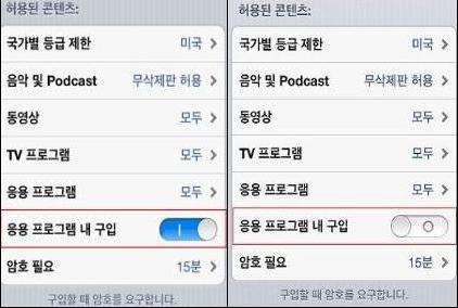 애플 앱 스토어의 경우 [일반]-[설정]-[차단]-[차단 활성화] 순으로 들어가 비밀번호를 입력하고 난 뒤 '응용 프로그램 내 구입'을 해제하면 인앱 구매가 원천적으로 차단된다. 단, 비밀번호 입력 시 아이폰 잠금해제 비밀번호와 다른 비밀번호를 입력해야 한다는 점을 유의해야 한다.