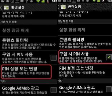 [Play 스토어]-[환경설정]-[PIN 설정 또는 변경]-[PIN 입력]순으로 들어가 비밀번호를 설정한 뒤 [구입시 PIN 사용]란을 체크한다면 인앱 결제시 반드시 PIN번호를 입력해야 결제가 가능해 무분별한 결제를 방지 하는 것.