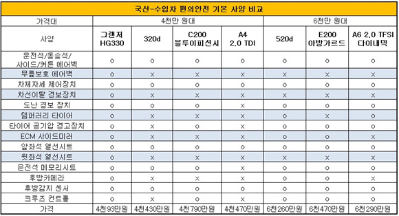 무릎보호에어백과 차선이탈 경보장치, 템퍼러리 타이어 등 안전사양도 그랜저에만 기본 적용돼 있다. 뒷좌석 열선시트와 후방카메라, 크루즈컨트롤 등 편의사양 역시 320d와 C200, A4에서는 찾아볼 수 없다.