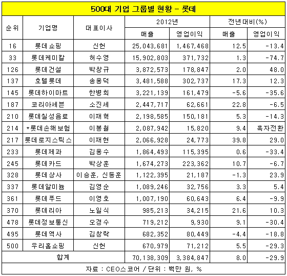 500대 기업에 포함된 롯데 계열사들은 지난해 매출이 8% 증가한 반면, 영업이익이 30% 가까이 감소해 실속없는 성장을 한 것으로 나타났다.
