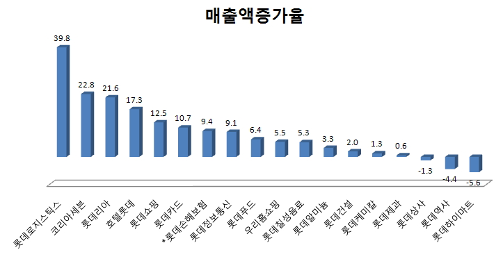 이어 코리아세븐이 22.8%, 롯데리아(대표 노일식)가 22.6%, 호텔롯데(대표 송용덕)가 17.3%, 롯데쇼핑이 12.5%, 롯데카드(대표 박상훈)가 10.7%로 상대적으로 높은 매출증가율을 보였다.