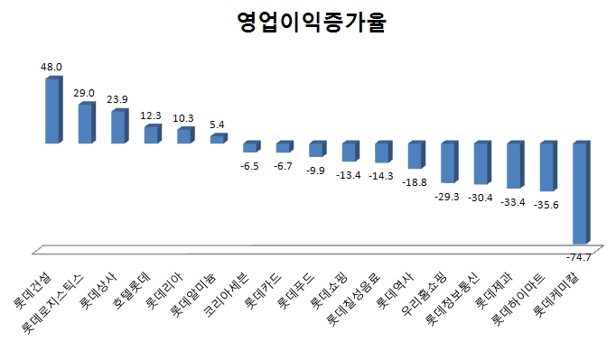 반면 롯데케미칼은 지난해 영업이익이 전년에 비해 74.7%나 줄어 감소폭이 가장 컸으며, 롯데하이마트(-35.6%)와 롯데제과(대표 김용수·-33.4%), 롯데정보통신(대표 오경수·-30.4%), 우리홈쇼핑(대표 신헌·-29.3%)도 크게 부진했다.