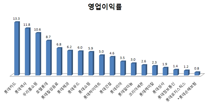 이어 롯데역사(11.8%)와 우리홈쇼핑(10.6%), 호텔롯데(8.7%), 롯데칠성음료(대표 이재혁·6.8%), 롯데제과(6.2%), 롯데푸드(6.0%), 롯데쇼핑(5.9%), 롯데하이마트(5%) 순으로 영업이익률이 높았다.
