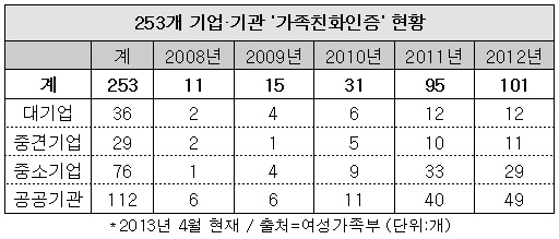 정부가 가족친화적인 직장문화 조성을 위해 가족친화인증제도를 2008년부터 시행하고 있지만 비용부담 등을 이유로 참여율이 매우 낮은 상황이다.