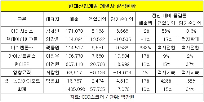 현대EP와 아이엔콘스, 아이콘트롤스, 영창뮤직, 평택동방아이포트 등 5개 계열사는 전년도에 비해 부채비율이 높아져 재무건전성에 적신호가 켜졌다.