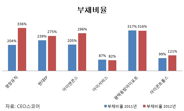영창뮤직은 204%에서 336%로 132%포인트 높아졌고, 아이앤콘스는 205%에서 296%로 91%포인트 크게 상승했다. 또 아이콘트롤스는 부채비율이 99%에서 121%로 22%포인트 올랐고 평택동방아이포트는 1%포인트 높아졌다.