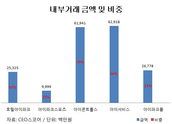 재무 상황을 공개하지 않은 호텔아이파크(대표 이치삼)와 아이파크스포츠(대표 김원동)는 내부거래 비중이 평균 90%에 달했다.