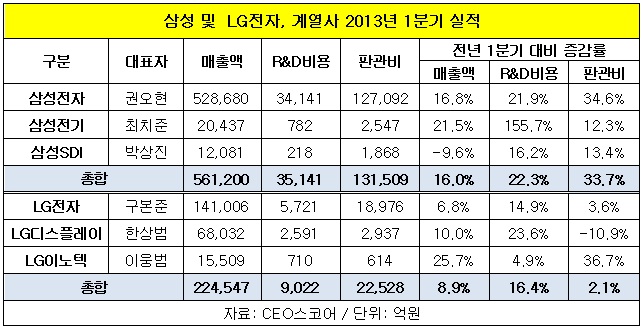 삼성 계열 3개사는 올 1분기 판관비 지출을 지난해 같은 기간보다 33.7%나 늘린 반면, LG 계열 3개사는 판관비 지출이 2.1% 늘어나는 데 그쳤다.