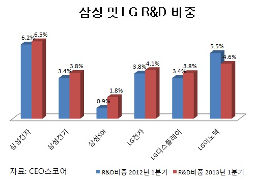 28일 재벌 및 CEO 경영성과 평가사이트인 CEO스코어(대표 박주근)에 따르면 삼성그룹 및 LG그룹 산하 전자 및 IT 계열사 6곳이 올 1분기 R&D 투자를 일제히 늘린 것으로 나타났다.