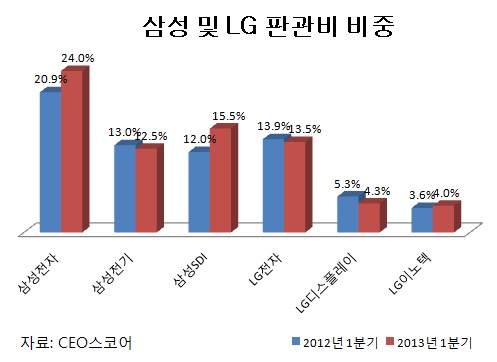 삼성전자와 삼성전기, 삼성SDI 모두 판관비 증가율이 두자릿수를 기록한 데 비해 LG전자는 3.6% 증가에 그쳤고 LG디스플레이는 10.9% 감소했다.