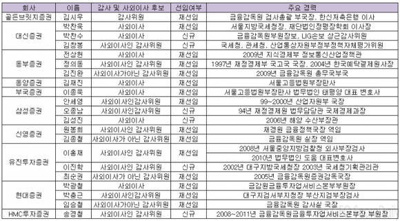 현대증권의 경우 다음달 7일 열리는 정기 주주총회에서 권력기관 출신인 3명의 사외이사와 감사위원을 전부 재선임하기로 했다.