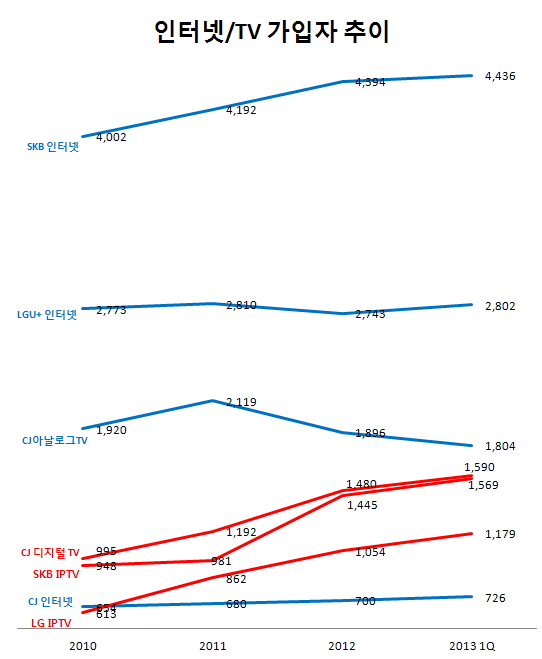 LG유플러스의 IPTV 가입자는 2010년 61만3천 명에서 올해 117만9천 명으로 2배 가까운 규모로 늘었고, SK브로드밴드 역시 2010년 94만8천 명에서 올해 156만9천 명으로 급증했다. CJ헬로비전은 디지털TV 가입자를 크게 늘렸다.