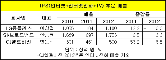 실제로 LG유플러스는 2012년 TPS(초고속인터넷+인터넷전화+IPTV)매출이 1조1천800억 원으로 전년보다 0.3% 감소했는데 그나마 인터넷전화(-4.3%)와 초고속인터넷(-5.4%)의 부진을 IPTV(32%)가 채워준 덕이었다.