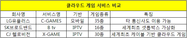 CJ헬로비전도 지난해 매출이 전년 대비 8.5% 이상 증가했는데 이 또한 아날로그 TV와 초고속인터넷의 부진을 디지털 TV로 상쇄한 결과다. LG유플러스와 SK브로드밴드, CJ헬로비전은 기존 사업의 부진이 계속 될 것에 대비해 또 다른 성장동력을 발굴하기 위해 최근 클라우드 서비스로 눈을 돌렸다. 클라우딩 기술을 게임에 적용한 신규 서비스를 내놓으며 기술력 대결을 펼치고 있는 것.