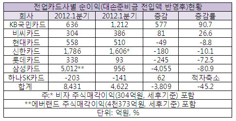 28일 금융감독원에 따르면 올해 1분기 7개 전업카드사의 순이익(대손준비금 전입액 반영후)이 전년보다 45.2% 감소한 4천622억원을 기록했다.