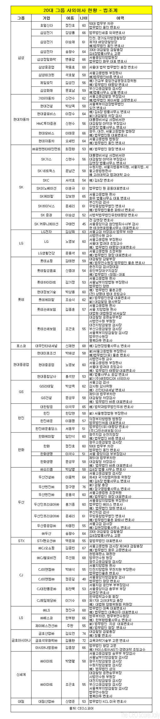 29일 재벌 및 CEO, 기업 경영성과 평가 사이트인 CEO스코어(대표 박주근)에 따르면 20대 그룹 사외이사 489명 가운데 법조계 출신 사외이사는 72명으로 전체 사외이사의 14.7%를 차지했다.