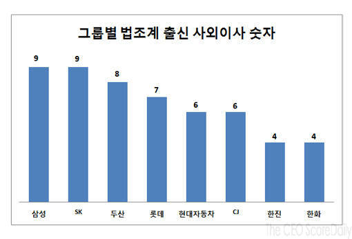 삼성(회장 이건희)과 SK(회장 최태원)는 각각 9명의 법조인 출신 사외이사를 영입해 20대 그룹 중 가장 많은 법조계 사외이사를 보유한 것으로 나타났다.