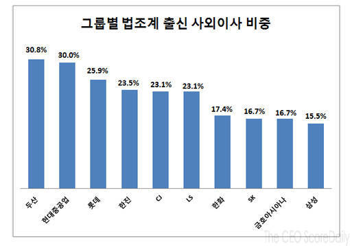 전체 사외이사 가운데 법조계 출신 인사가 차지하는 비중을 따질 경우 두산 그룹이 26명 중 8명을 법조계 출신으로 영입해 30.8%의 높은 비중을 보였다.