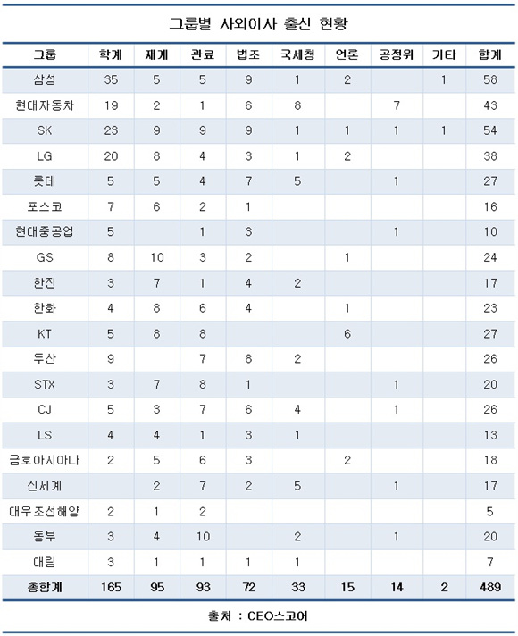 롯데그룹도 학계 출신은 단 5명에 불과하고 관료는 법조계 7명, 국세청 5명을 포함 총 17명에 달했다.