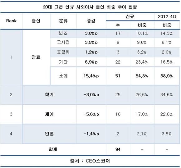 법조계 국세청 공정위 출신을 모두 포함한 관료 출신 신규 선임 사외이사는 총 51명으로 전체 94명중 54.3%를 차지했다. 2013년 주주총회가 열리기 전인 지난해 말 38.9%에 비해 비중이 15.4%포인트 크게 높아졌다.