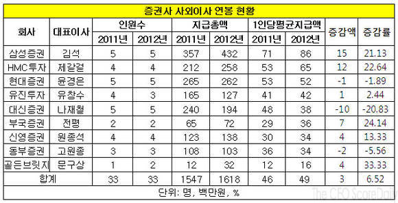 사외이사 평균 급여가 가장 높은 삼성증권도 21.13%에 달하는 높은 증가율을 보였다. 뒤이어 신영증권은 2011년 3천만 원이었던 평균 급여가 13.33% 올랐고 유진투자증권은 2.44% 증가에 그쳤다. 이에 비해 대신증권은 사외이사 1인당 평균 급여가 전년보다 20.83%나 낮아져 가장 큰 폭의 하락을 기록했다. 또 동부증권은 5.56%, 현대증권은 1.89% 하락했다.