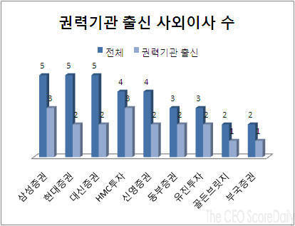 사외이사가 3명인 동부증권은 전상헌 전 지식경제부 정보통신 산업정책관, 정의돈 전 재정경제부 국고국 국장이 포함됐다. 골든브릿지증권은 강철준 전 한은 조사1부 조사역, 부국증권은 이종욱 전 서울고등법원 부장판사가 권력기관 출신이다.