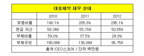 31일 재벌 및 CEO, 기업경영성과 평가사이트인 CEO스코어(대표 박주근)에 따르면 대웅제약은 지난 2010년 59.0%였던 부채비율이 작년 말 24.8%로 떨어진 반면, 유동자금 상태를 나타내는 유동비율은 190.1%에서 295.1%로 상승하는 등 재무건전성이 크게 향상됐다.