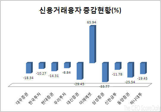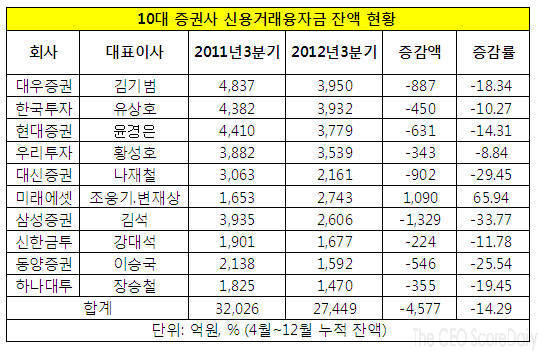 신용융자 잔액이 가장 많이 줄어든 곳은 삼성증권으로 전년보다 금액으로는 1천329억 원, 비율로는 33.77%나 감소했다. 동양증권은 전년보다 546억원 줄면서 25.54%의 감소율 기록했고 대신증권은 전년보다 902억 원이 줄어 29.45%의 감소율을 보였다. 하나대투증권(19.45%), 대우증권(-18.34%), 현대증권(-14.31%), 신한금융투자(-11.78), 한국투자증권(-10.27%)가 10%를 웃도는 감소율을 나타냈다. 우리투자증권은 전년보다 343억 원 줄어 8.84%의 감소율을 기록했다.