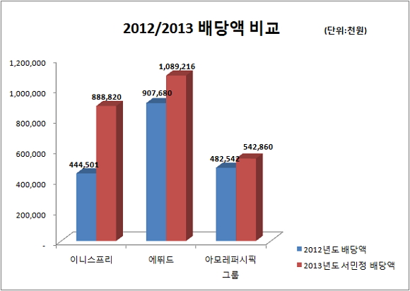 민정 씨가 지분을 양도받은 뒤 배당금이 이처럼 갑자기 늘어난 것은 이니스프리와 에뛰드가 배당률을 크게 높인 덕분이다.
